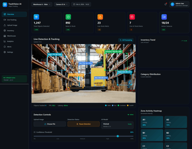 AI-driven object tracking enables accurate detection, classification, and counting of assets in real time. Using computer vision, the system monitors material movement, stock levels, and inventory flow across warehouses and production areas. This reduces manual counting efforts, minimizes discrepancies, and improves inventory visibility and control.