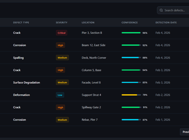 Our AI models analyze visual data to detect structural anomalies such as cracks, surface degradation, and defects in infrastructure. Early identification of potential failures enables predictive maintenance, reduces inspection time, and enhances asset safety while minimizing manual intervention.